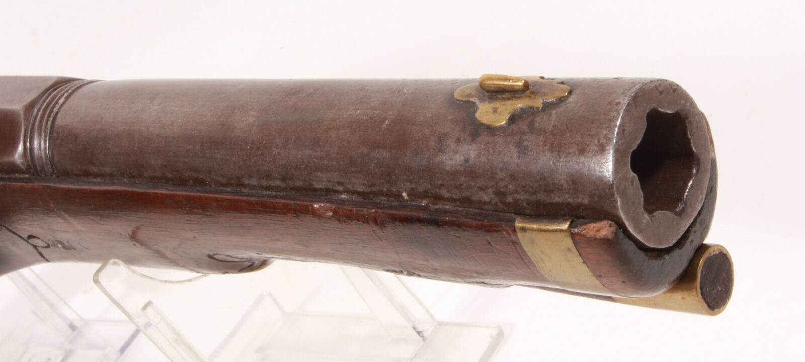 Konischer Achtkantlauf über Baluster und Perlrand auf rund übergehend, aufgesetztes Messingkorn auf wappenförmigem Grund. Lauf signiert T-Iliz LE. Flache Schlossplatte. Massive, spätbarock ausgeformte Messingbeschläge. Kräftiger Nussbaumschaft mit Zierlinien. Schaftabschluss mit Messingband. Originaler Ladestock. Länge 43 cm, Lauflänge 23,5 cm. Sehr guter Zustand und Funktion, kräftige Federn, saubere Rastung. Lauf matt mit partieller Fleckenbildung und extrem tiefen Balkenzügen.