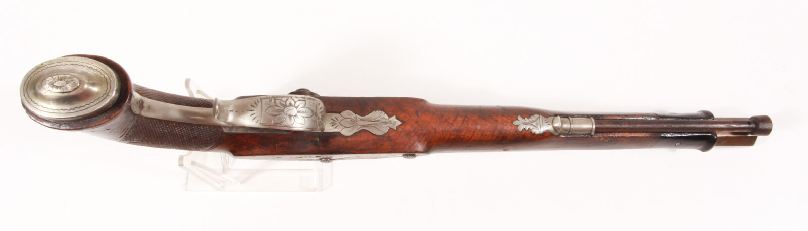 Achtkantiger Lauf mit Silberkorn, Kimme, graviertes Schwanzschraubenblatt mit Seriennummer 5757. Schloss mit Randstichgravur und floraler Dekoration. Neusilberbeschläge, welche typisch für Suhl sind, graviert mit floralem Dekor. Neusilberschaftkappe. Fischhautverschnittener Schaft mit Ebenholzabschluss. Ladestock ergänzt. Länge 44 cm, Lauflänge 29 cm. Sehr gute Funktion, kräftige Federn, saubere Rastung. Leicht matter Lauf mit scharfen, geraden Balkenzügen.
