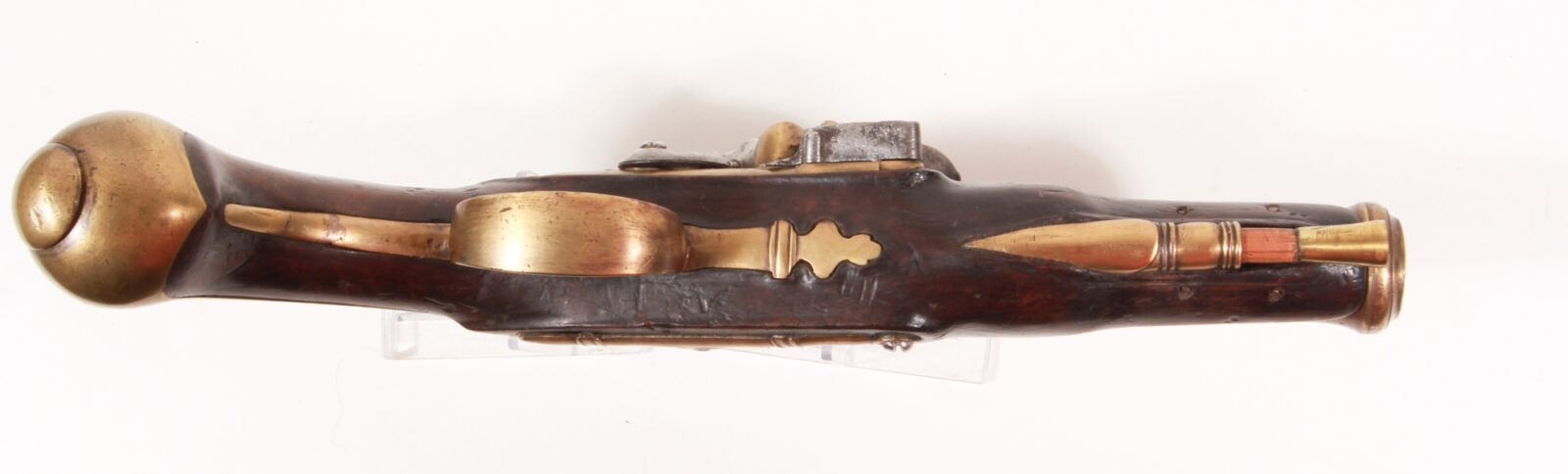 Schwerer 16-kantiger Messinglauf über Baluster auf runde Kanonenform übergehend. Messingschlossplatte signiert „Duval a Nantes“. Rippenverzierte Messingbeschläge, Knauf mit langen Spangen und ovalem Knaufplättchen. Gemaserter Nussbaumschaft im Rücken mit reicher floraler Silberdrahteinlage und Blattwerk. Länge 27 cm, Lauflänge 13,5 cm. Sehr guter Zustand und Funktion, kräftige Federn, sehr gute Rastung. Duval ist in Nantes Loire Atlantic erwähnt um 1760-1770.
