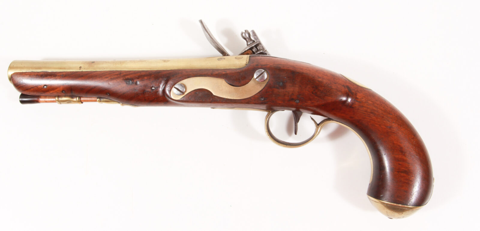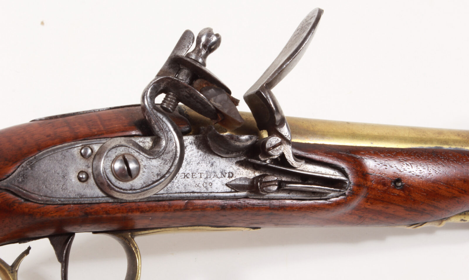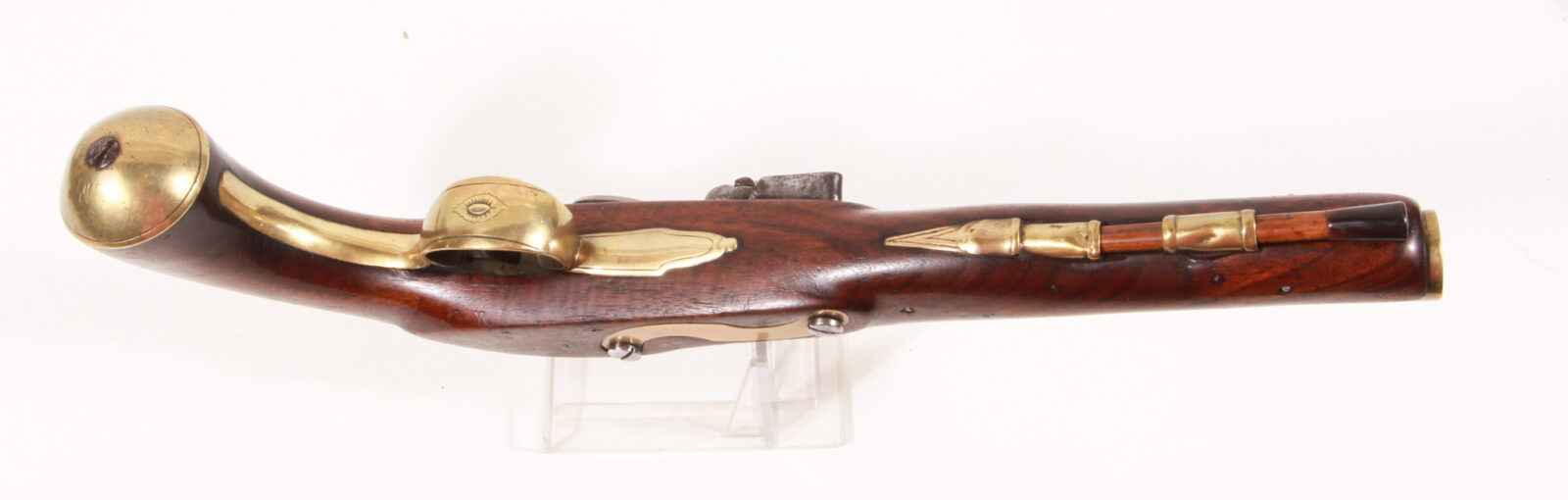Konischer Messingrundlauf mit geschweifter Mündung, in Schriftkartusche signiert „London“. Tief geschlagene Londoner Ovalmarken „GP“ mit Krone und „V“ mit Krone (Gunmakers proof und View). Floral gavierte Stahlschwanzschraube. Flache Schlossplatte mit Randstichgravur, signiert „W.Ketland & Co.“. Messingbeschläge mit Randstichgravuren und stilisierter Blüte am Abzugsbügel. Gemaserter Nussbaumschaft mit ovaler Monogrammplatte. Originaler Ladestock mit schwarzem Horndopper. Länge 34 cm, Lauflänge 20 cm. Schlossplatte minimale, gereinigte Rostpünktchen, Ladestockröhre mit kleiner Druckstelle, sonst sehr guter Zustand, kräftige Federn, gute Rastung.