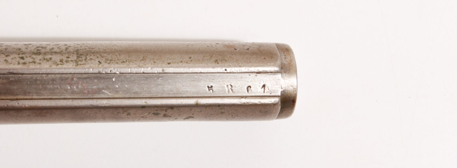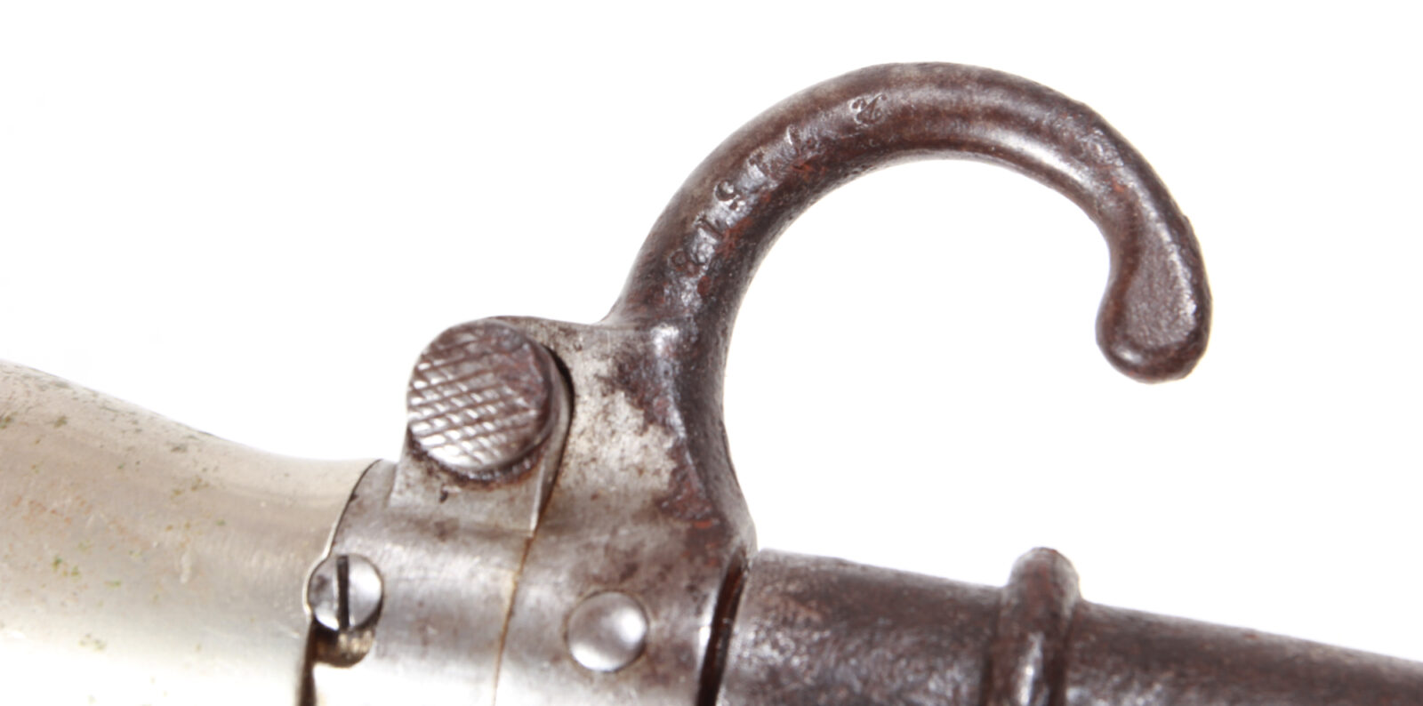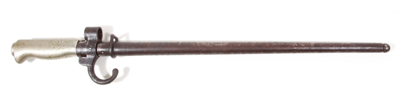 Vierkantklinge mit Parierstange und Seriennummer, gefederter Drücker, Weißmetallgriff. Führungsnut gestempelt mit deutscher Regimentskennzeichnung. Stahlscheide mit Riemenöse und Kugelspitze. Länge 46,3 cm, Klingenlänge 34,3 cm. Klinge sehr guter Zustand, Scheide feine gereinigte Rostpünktchen. Dieses Bajonett wurde nach Kürzung und Umarbeitung der Scheide von der Wehrmacht und dem Volkssturm geführt.