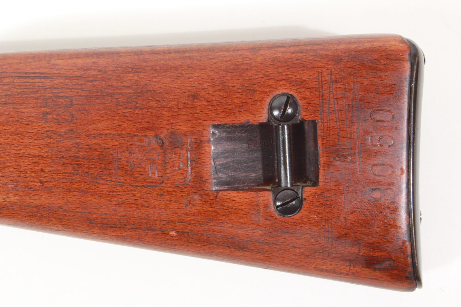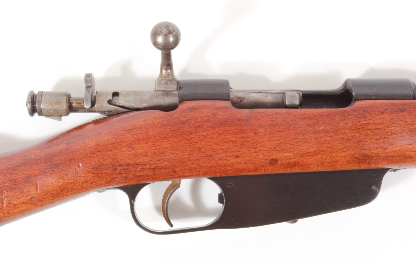 Konischer Rundlauf, feststehende Visierung, gestempelt Kaliber 7,35 mm, Kammer mit Kaliberbezeichnungen und gültigem englischen Beschuss, Kammer signiert RE Terni (Herstellungsort, Italien) mit Krone, seitlich 1938 und römischen Ziffern, Hülse mit englischen Beschusszeichen, gebogener Kammerstengel, Abzug mit Magazinkasten, Buchenholzschaft mit Handschutz mit diversen Stempelungen, Lauf-, System- und Schaft Nummerngleich, Länge: 101,5 cm