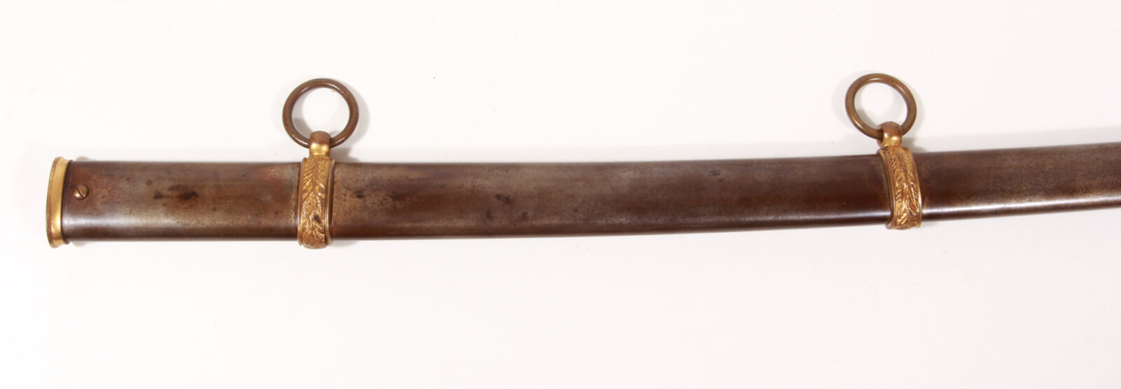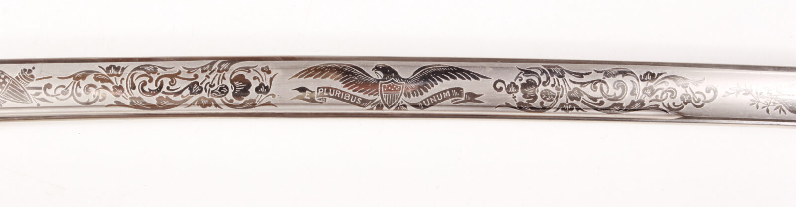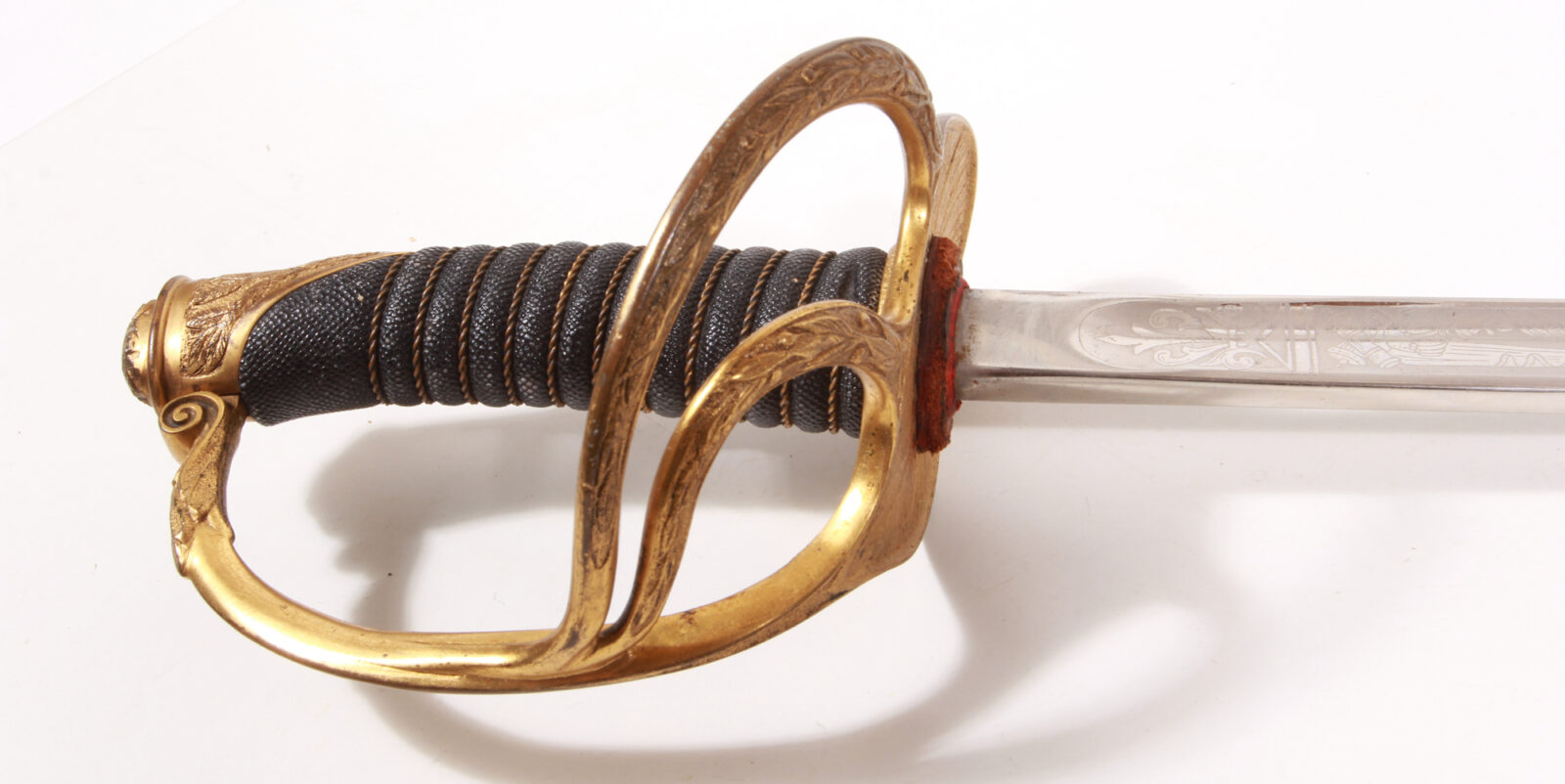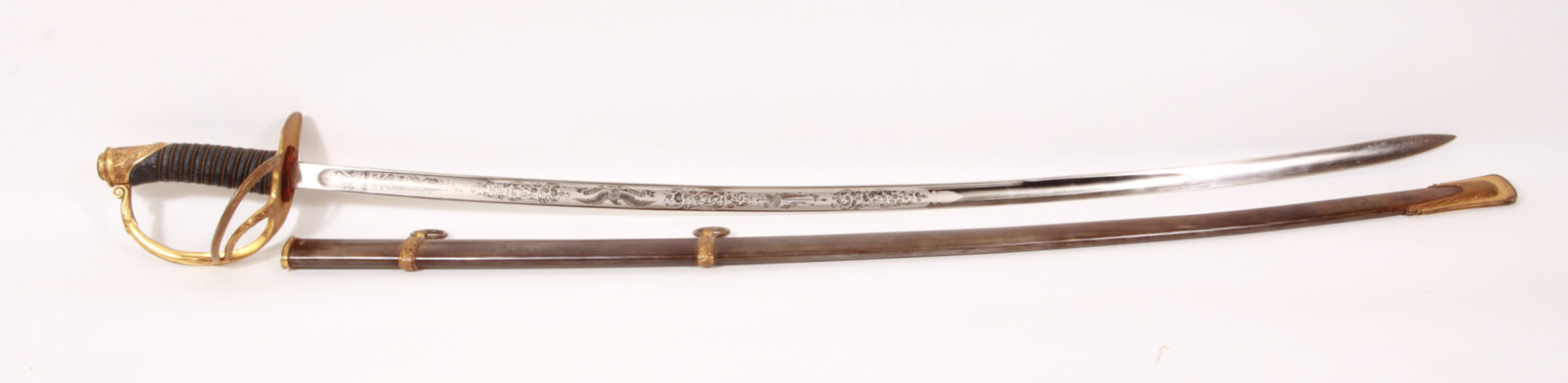 Einschneidige Säbelklinge mit breiter Flutung, im Mittelbereich eine zweite, schmale Flutung, signiert „Springfield Armory Springfield Mass. USA“. Feine Klingenätzung signiert „U.S.“, Gegenseite mit US-Adler und Wahlspruch zwischen feinen Trophäenätzungen. Messinggefäß mit zwei Spangen, Außenseite mit Strahlenkranz, innen mit Adler und Sternen. Der Knauf mit Laubwerk und US-Wappen. Gefäß feuervergoldet. Holzgriff mit Rochenhaut bezogen und Messingdrahtwicklung. Stahlscheide mit Messingmund und zwei beweglichen Trageringen, Schlepper mit Strahlendekor, alles feuervergoldet. Länge 100 cm, Klingenlänge 86,6 cm. Aufgrund der Klingenätzung und der Signatur kann das Stück zwischen 1900 und 1902 eingeordnet werden, es wurden ca. 300 Stück/Jahr produziert. Stahlscheide mit hauchdünner, glänzender Patina, sonst nahezu neuwertiger Zustand. Siehe Burton Kellerstedt „Early Sword and Sabers of the Armory of Springfield“ Fig. 20.