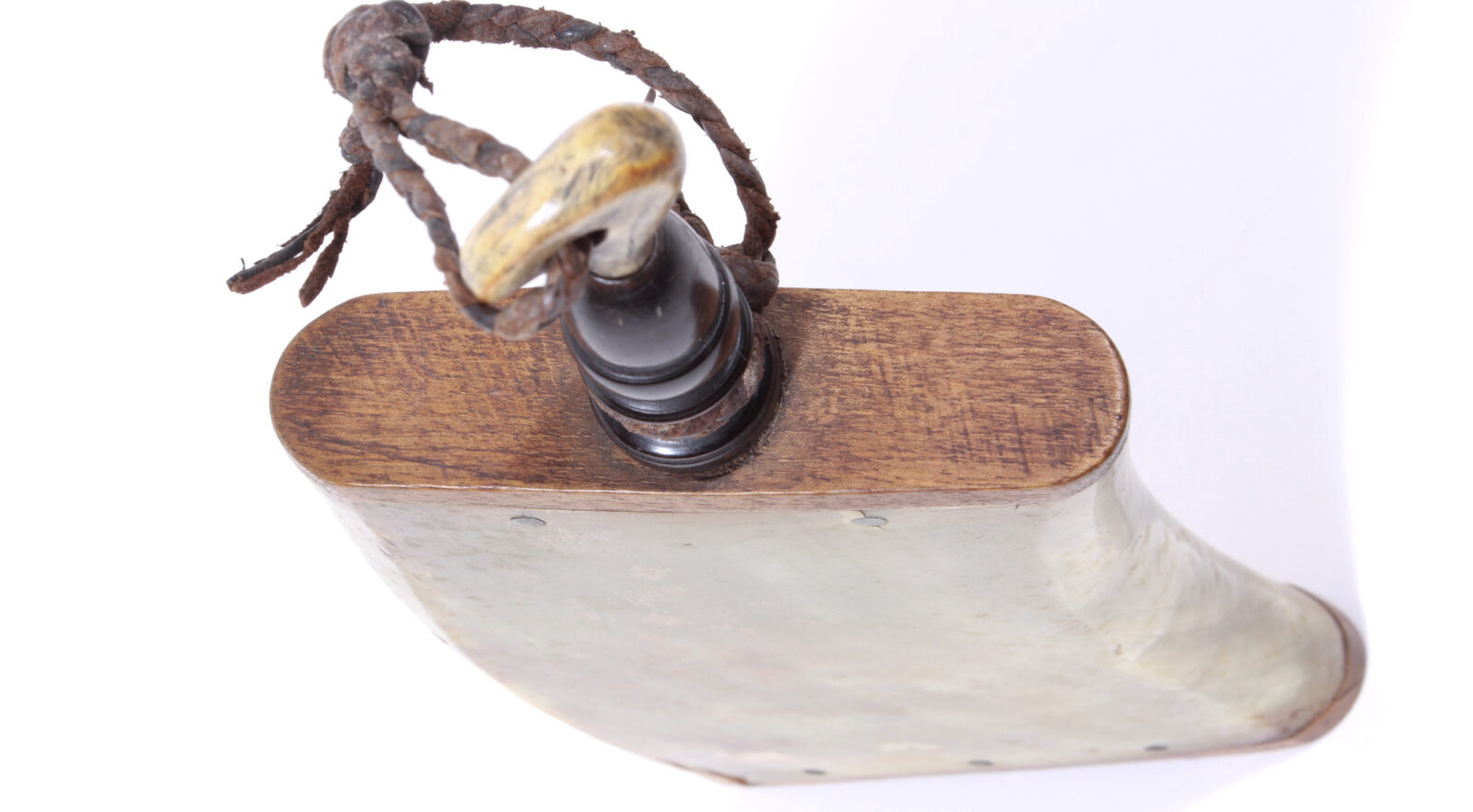 Flacher, gemaserter Holzkorpus, mit Horndübeln verstifteter Holzboden und Deckel. Eichelförmige Schütte aus poliertem, schwarzen Büffelhorn. Verschlussstopfen aus hellem Geweih, verbunden mit geflochtenem Lederband. Länge 24 cm. Holzboden mit Tragespuren, sonst sehr guter Zustand.