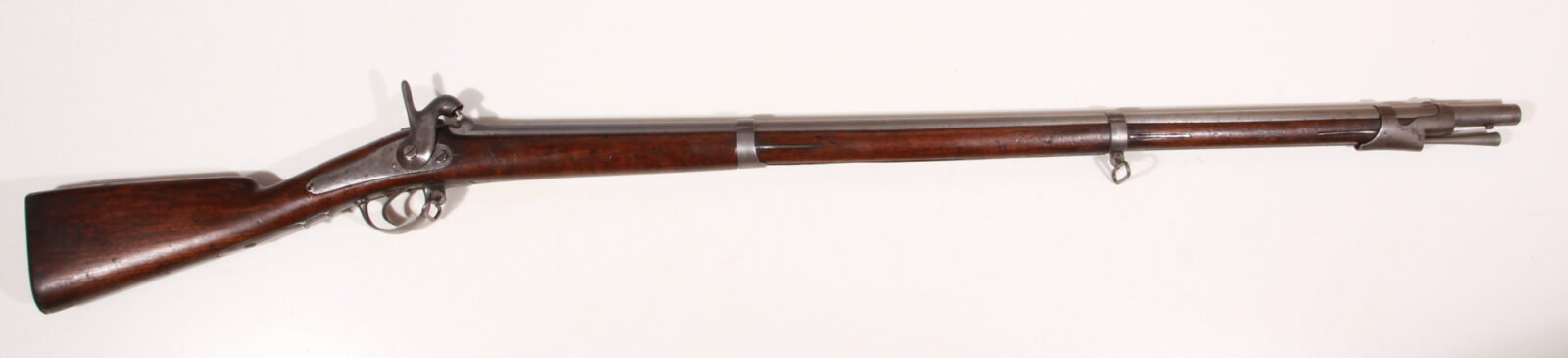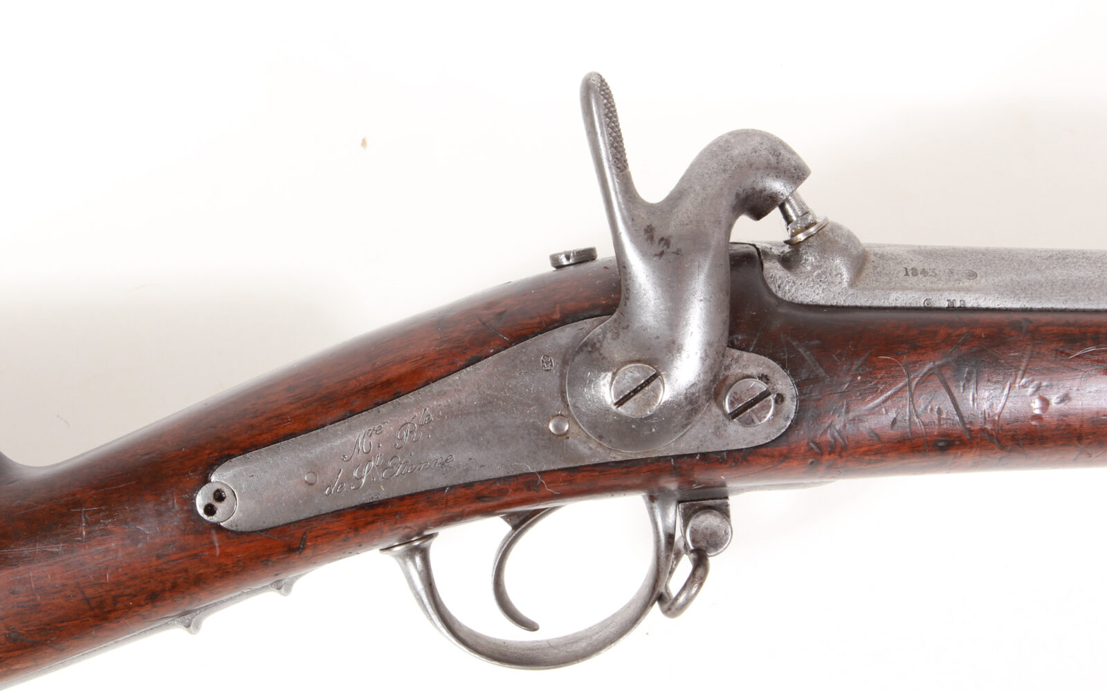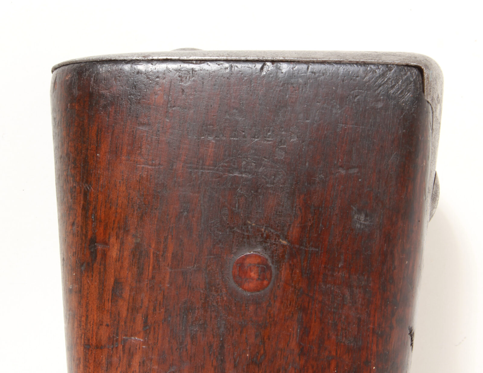 Konischer Rundlauf mit oktagonaler Kammer, gestempelt mit Seriennummern und Abnahmen sowie Datierung 1843, rückliegendes Schloss gestempelt Mre Rle. de St. Etienne, mit französischen Abnahmen, Stahlbeschläge mit französischen Abnahmen, gemaserter Nussbaumschaft mit Rundstempel und Stempelung St. Etienne sowie „1213“, minimale gereinigte Rostpünktchen, Schaft mit kleineren Krätzerchen, Holz im Bereich der Ladestocknut kleiner Ausbruch, Laufinnenzustand: mit 4 Zügen noch etwas blank, im vorderen Bereich mit vereinzelten Narben, originaler Ladestock, Länge: 142 cm.