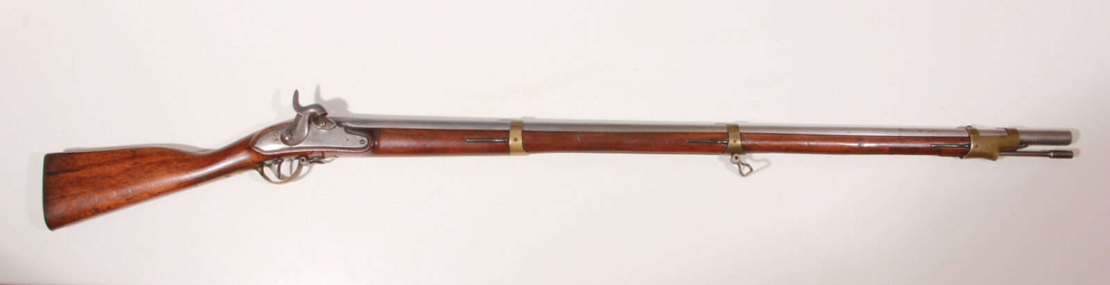 Konischer Rundlauf mit oktagonaler Kammer mit preußischen Abnahmen, Seriennummer und Datierung ML 1818, die gekantete Schlossplatte signiert FW Saarn T, Pistonsockel mit Reinigungsschraube, Messingbeschläge mit preußischen Abnahmen, Messingbeschläge nummerngleiche Waffe, die Kolbenkappe mit Regimentstempeln 30.L.W.R. und weiterer nummerngleicher Zahlenreihe, Nussbaumschaft, Zustand: Laufinnenzustand blank mit minimalsten Pünktchen, die Kammer im Piston und Pistonsockelbereich gereinigte Rostnärbchen, Holz im Bereich der Ladestocknut kleiner Ausbruch, sonst sehr guter Zustand und Funktion. Ladestock vermutl. Reproduktion, Länge: 144 cm.