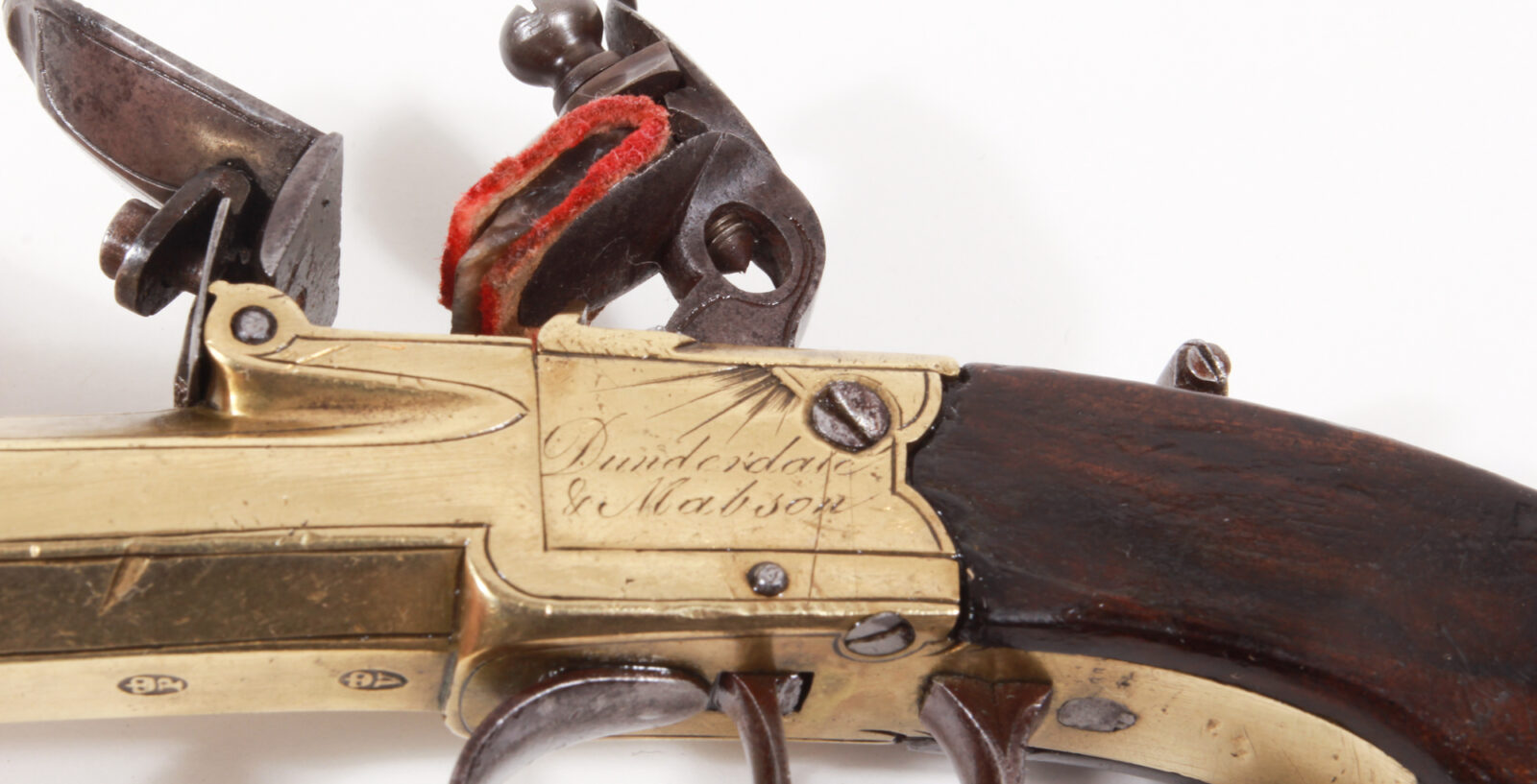 Einteiliges Messingsystem mit Lauf, der Lauf mit Kanonenbalustern und Tromblonmündung. Kammer achtkantig, System graviert mit Waffentrophäen. Gegenseite unter Sonnenstrahlen graviert „Dunderdale und Mabson“. Schiebesicherung, welche Hahn und Batterie gleichzeitig sichert. Unterseite tief mit Londoner Abnahmen P und V unter Krone gestempelt. Gemaserter Nussbaumschaft gestempelt mit Besitzerstempel „T.Rawling“. Länge 17,5 cm. Der Tromblonlauf geht von 11,5 mm auf 16,2 mm. Dunderdale und Mabson sind in Birmingham von 1799 bis 1803 erwähnt, s.Stöckel Bd. 1 S. 317.