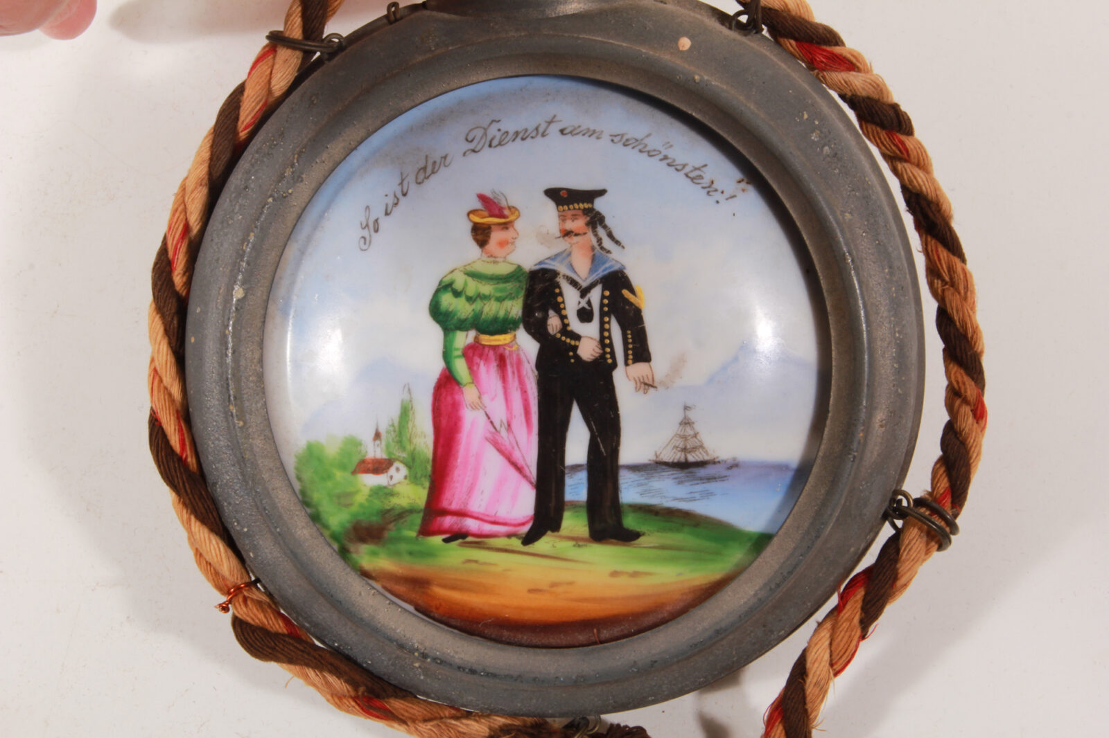 Sehr gut erhaltene Porzellanflasche, handbemalt mit maritimen Szenen. Umlaufend Metallring, vernickelt. Rückseite Matrose mit Braut. Obermatrose Gerd de Buhr. 3. Companie 2. Matrosenartillerieabteilung Wilhelmhaven. Verschluss mit fliegendem Adler. Länge 19 cm. Sehr guter Zustand. Vollständig erhaltene, farbige Tragekordel.