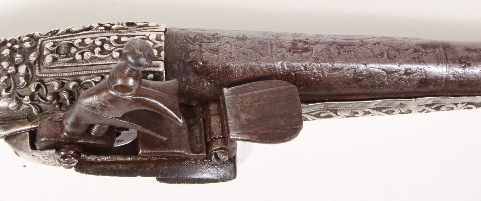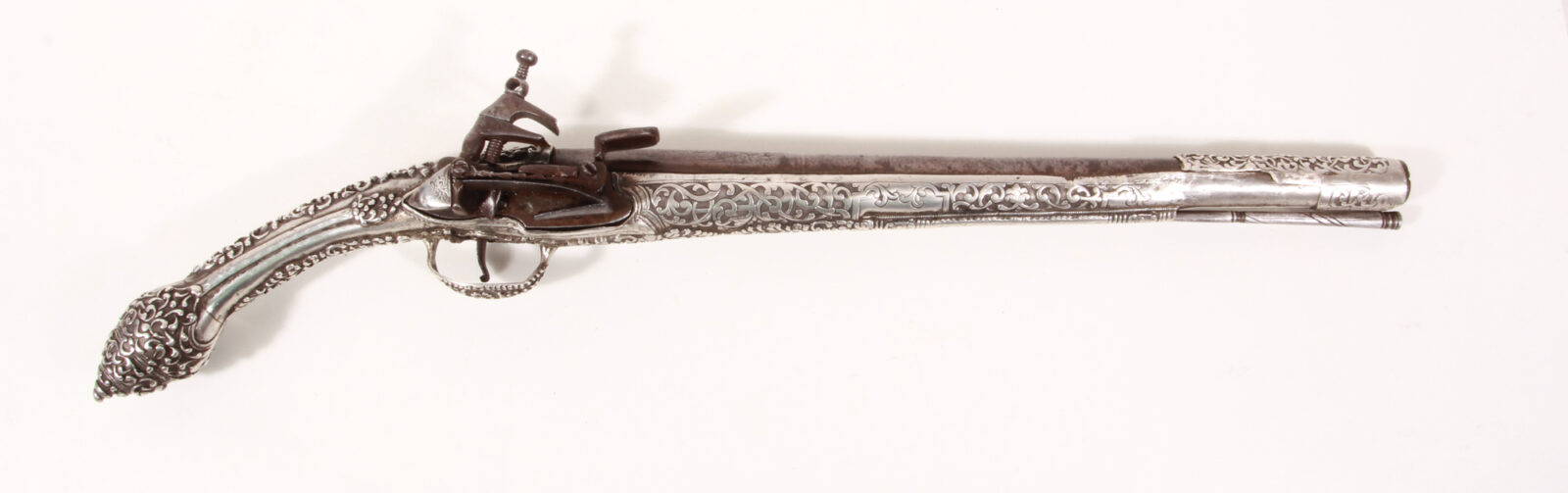 Achtkantiger auf rund übergehender Lauf, Kammer mit feinem Eisenschnittdekor. Schloss mittig gemarkt, Schlossplatte mit silberner, gravierter Federabdeckung. Silberschaft, vorderer Teil mit erhabener Rollwerksdekoration, der Grund fein gepunzt. Der hintere Teil mit gegossenen, fein ausgearbeiteten floren Noppen, Blüten und Ranken. Eiserner originaler Ladestock. Länge 53 cm, Lauflänge 34,5 cm. Lauf mit gereinigten Rostflecken, Silberschaft im vorderen Bereich linksseitig kleinere Reparatur, sonst sehr gut erhalten und sehr gute Funktion mit kräftigen Federn. Der Silberschaft besteht aus einem Holzkern, der mit dickem Silberblech ummantelt ist. Der Teil hinter dem Schloss ist nahezu massiv. Bei dieser Pistole ist der Ladestock herausnehmbar und voll einsatzfähig, was in den meisten Fällen nur angedeutet ist.
