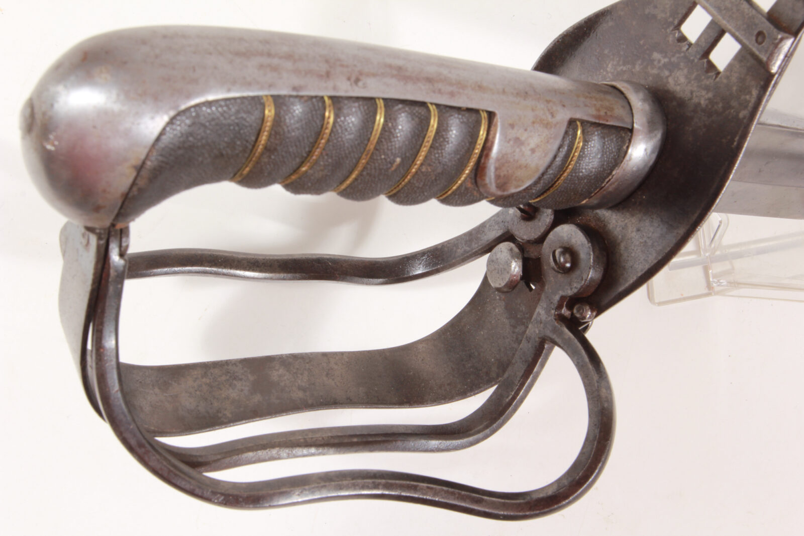 Leicht gebogene Rückenklinge mit breiter Flutung, Wurzel gestempelt mit Doppeladler und „Ohligs“ sowie CC und E. Gerillter Holzgriff mit feiner, schwarzer Rochenhaut und feiner Messingdrahtwicklung. Gefäß im Bereich des Stoßleders gestempelt Strierny in Wien. Zwei bewegliche Springbügel, Innenseite mit Druckknopf. Länge 100 cm, Klingenlänge 86,4 cm. Linker Springbügel mit Federkammer, rechts mit Doppelspange und darunter Federkammer. Wenn beide Griffbügel zusammengedrückt werden, kann man den Auslöseknopf zurückdrücken. Vor dem Einsatz betätigt man den Druckknopf und die Griffbügel springen auf. Rochenhautwicklung mit zwei minimalen Schadstellen, sonst sehr guter Zustand und Funktion. Das Modell 1827 hat nur einen Springbügel und war für Stabsoffiziere der Husaren und Ulanen ausgegeben. Bernhardt Ohligs war Kaiserlich-Königlicher Hoflieferant. Siehe Lexikon „Hieb- und Stichwaffen“ Nr. 257, S. 207.