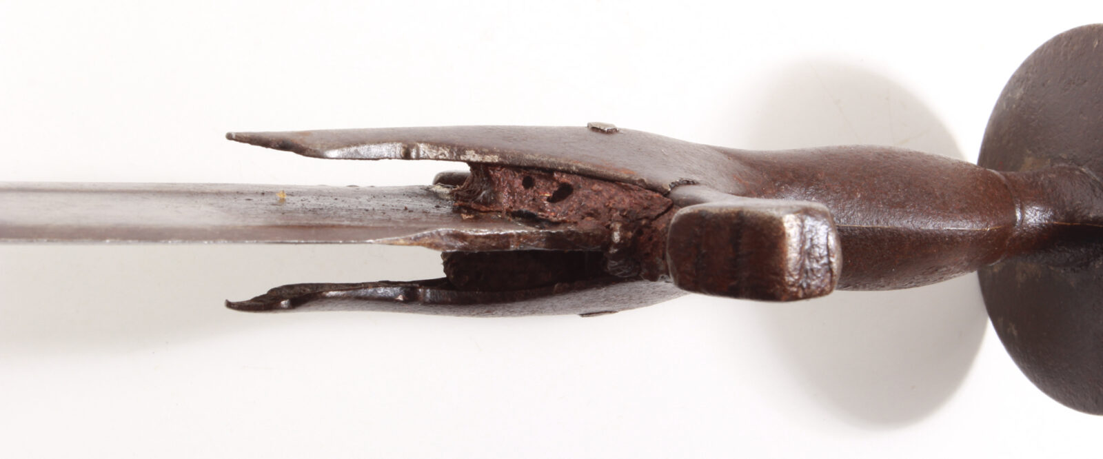 Breite, geflutete Keilklinge. Einteiliger Griff mit Spangen und abgestuften Parierenden. Runde, eingezogene Knaufscheibe mit rückseitigem Stern. Länge 89 cm, Klingenlänge 77 cm. Ein Parierestangenende mit Haaranriss, sonst guter, patinierter Zustand.